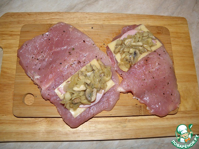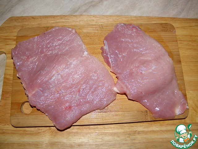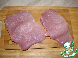 Свинину нарезаем карманом (первый надрез не до конца, второй полностью, чтоб кусочек открыть, как книжку)