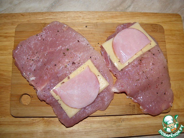 На каждый кусок выложить сыр с ветчиной.