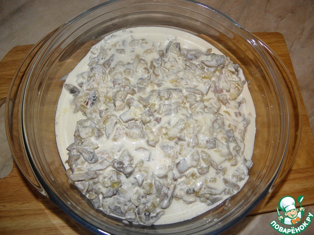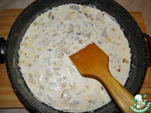 Вернемся к соусу: В Остальную часть грибной начинки, которая у нас осталась на сковороде, вливаем сливки, добавляем чуть бульона, или воды (на специи проверяем!) И буквально минуту после закипания держим, затем выключаем.