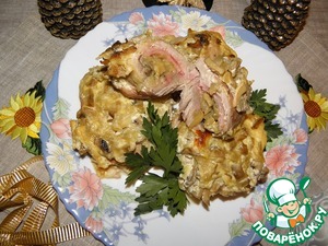 И, кстати, довольно оригинальный, по-моему. Обычно фаршированную таким образом свинину жарят в панировке, а здесь - запеченная в соусе!