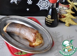 Поливаем рыбу соевым соусом ТМ "Киккоман", посыпаем смесью молотого перца, натираем сверху на тёрке чеснок.