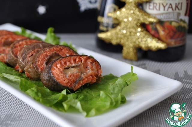 Кладём на смазанную маслом форму, смазываем сверху соусом-маринадом Teriyaki. Ставим в нагретую до 200 градусов духовку и запекаем 20 минут. -