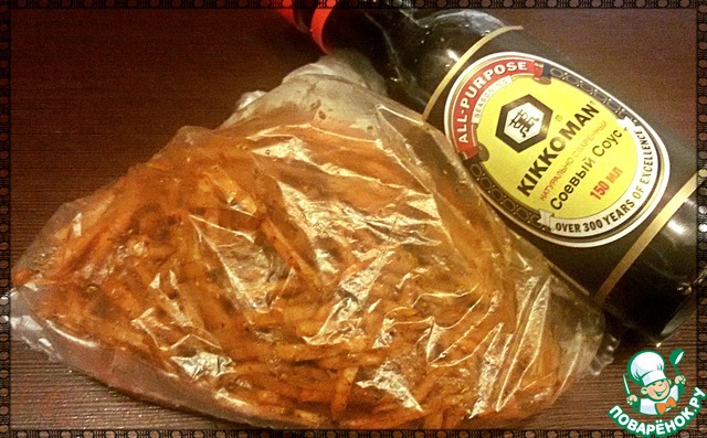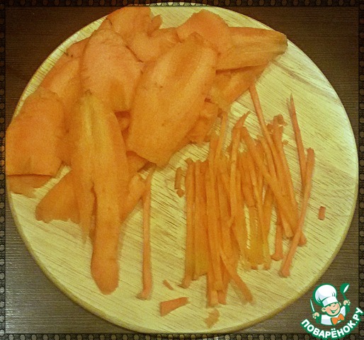 • Морковь очистить, нарезать тонкими ломтиками и затем мелко соломкой. Можно морковь натереть на терке для корейской моркови.