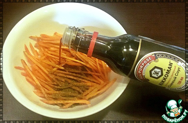 • В емкость с морковью добавить молотый кориандр, черный перец и соевый соус ТМ Kikkoman (натурально сваренный).