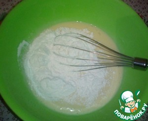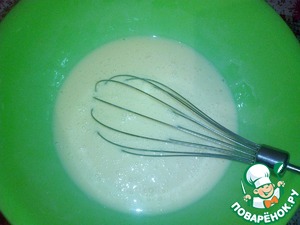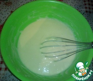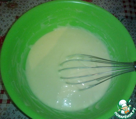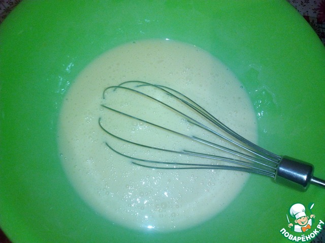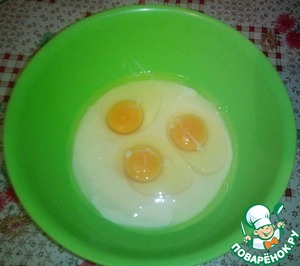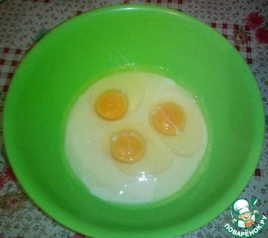 Выливаем 1 банку сгущенного молока, добавляем 3 яйца и 1 чайную ложку разрыхлителя