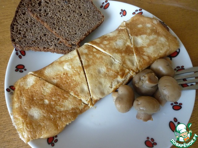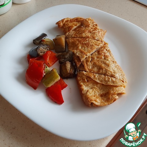 1/3 часть яичной массы вылить в сковороду и поджарить (на среднем огне) тонкий блинчик. Затем края завернуть к центру и... -