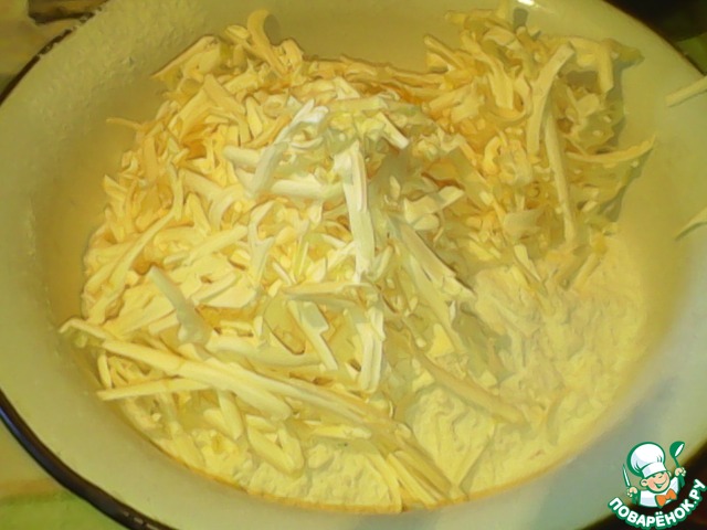 В миску насыпать два с половиной стакана муки и половину чайной ложки соды, натереть на терке маргарин.
