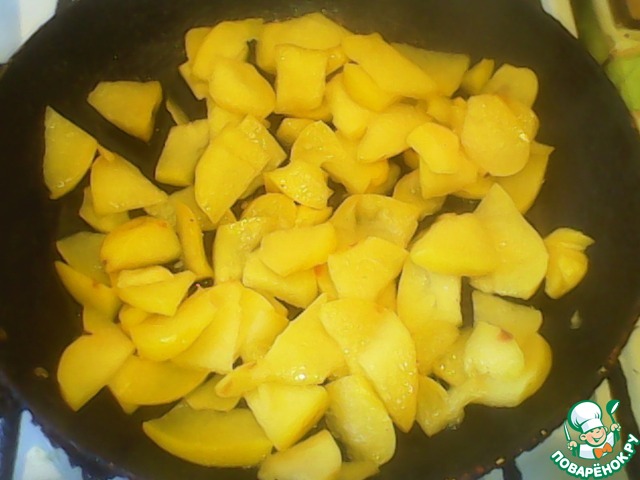 В сковороду налить 4 ст. л. воды, выложить айву. Присыпать ее 3 ст. л. сахара и закрыть крышку. Потушить айву на среднем огне до мягкости. Открыть крышку и подождать, пока испарится жидкость.