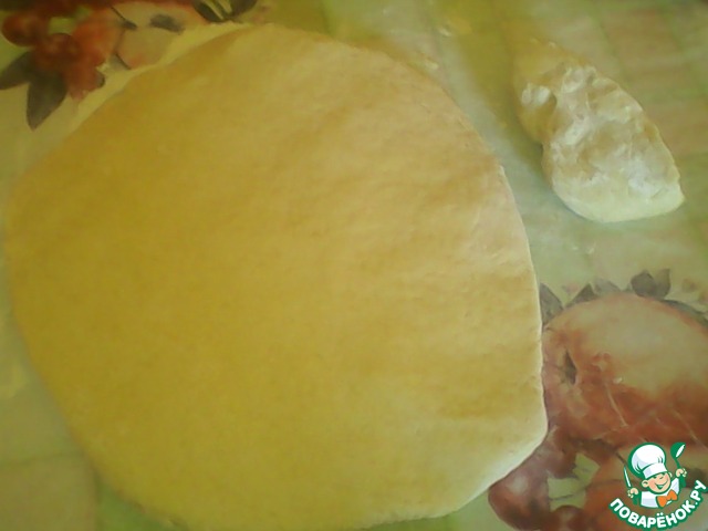 От теста отрезать маленький кусочек, он пойдет для украшения. Большую часть теста раскатать немножко, переложить на противень. Противень посыпать мукой.