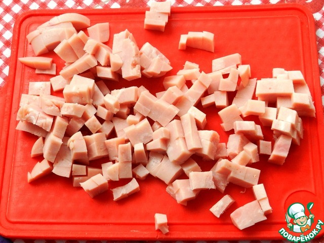 Ветчину нарезать кубиками (я использовала ветчину из индейки).