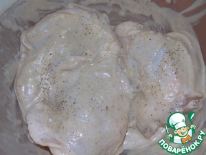 Обмазать курицу маринадом, убрать в холодильник на 30 минут.