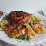 В смазанную форму для запекания разложить ломтики картофеля, тонко порезанного, посыпать немного солью и укропом. Сверху выложить кусочки курицы и смазать томатным соусом.