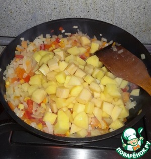 На растительном масле обжариваем лук, морковь, болгарский перец и картофель. Обжариваем минут 10-15