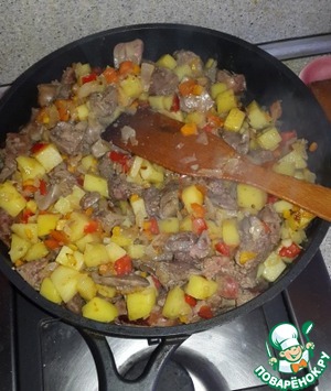 Обжаренные овощи соединяем с печенью и обжариваем все вместе минут 5