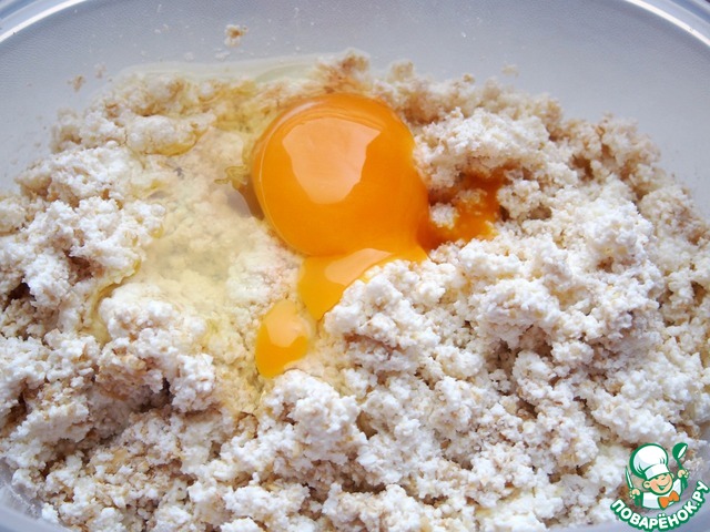Творог (у меня деревенский) размять вилкой, добавить измельченные геркулесовые хлопья и сахар. Перемешать.