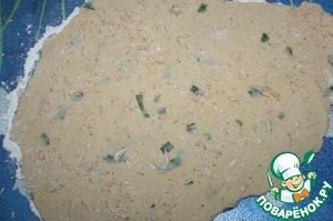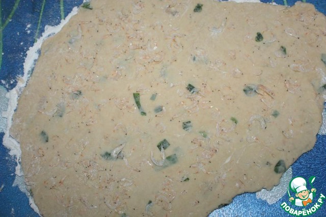 Раскатать тесто в лепешку, сверху посыпать оставшимися креветками и прокатать скалкой