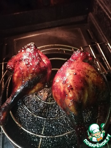 Духовку разогреть до 200 градусов. Окорочка положить на решетку кожей вниз. Под решетку не забыть поставить противень, чтобы туда стекал жир. Периодически смазывать окорочка маринадом.