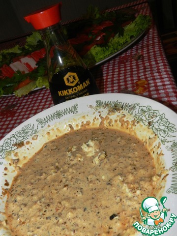 • К орехам добавить майонез и соевый соус Kikkoman, всё тщательно перемешать.