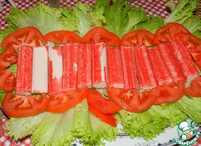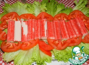 • Зелёный салат промыть, выложить на блюдо. Сверху выложить крабовые палочки. Помидор нарезать ломтиками и выложить вокруг палочек.