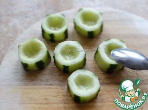 Порезать огурец на части и ложкой вынуть сердцевину, оставив тоненькое донышко;
