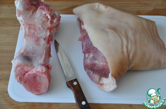 Берём свиную рульку, моем, чистим щёткой, обсушиваем. Острым ножом аккуратно вырезаем кость, не нарушая целостности шкурки.