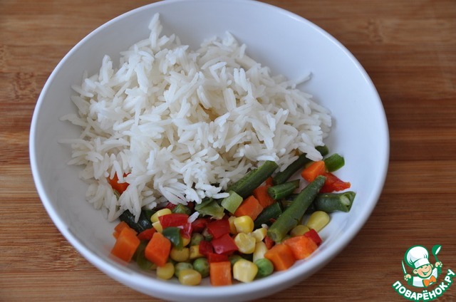 Смешиваем рис и овощи, солим. -