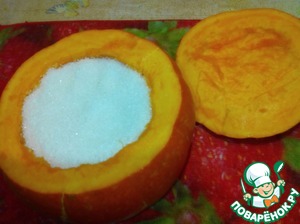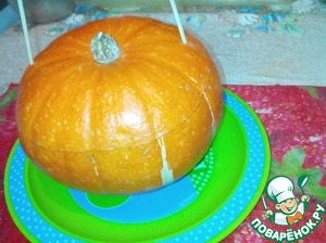 Закрываем срезанной верхушкой, ставим тыкву в глубокую тарелку и оставляем при комнатной температуре на 7-10дн.