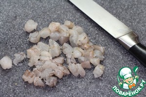 Пока овощи обжариваются, креветки почистить, удалить темную кишечную вену, нарезать кусочками.