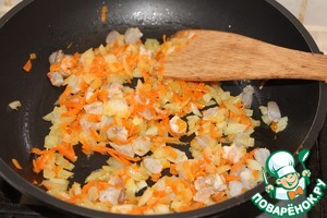 Обжарить на растительном масле лук, нарезанный кубиками, с морковью, натертой на терке. Овощи готовить 5-7 минут.