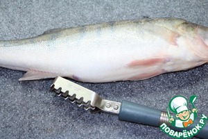 Судака тщательно очистить от чешуи. На фото приспособление для чистки рыбы, чрезвычайно удобное.