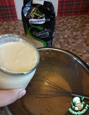 Для бисквита взбейте яйца с сахаром (я использовала коричневый сахар Мистраль) и ванилином, добавьте простоквашу и снова взбейте