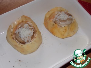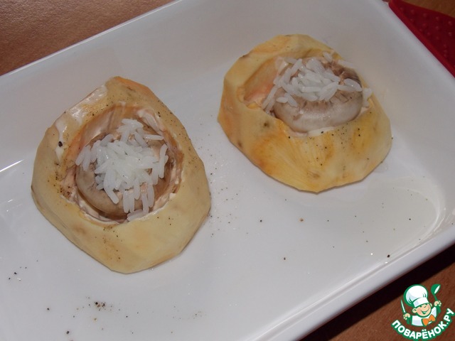 Готовый рис немного подсолить. Разложить в грибные шляпки.