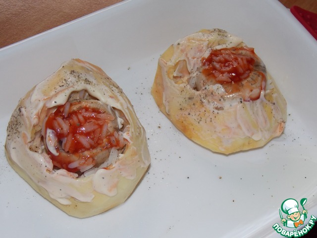 Смазать грибы с рисом кетчупом, а батат со всех сторон майонезом.