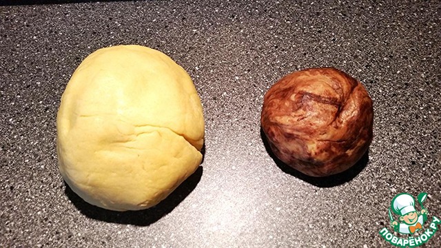 Тесто разделите на три равные части. В одну часть добавьте чайную ложку какао. Каждую часть раскатайте в прямоугольный пласт.