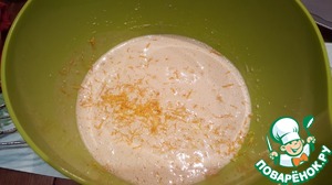 Заливка: Взбить яйца с сахаром до растворения последнего. Добавить йогурт и цедру одного апельсина. Можно сначала добавить к йогурту крахмал. Перемешать. Разогреваем духовку до 180 градусов.