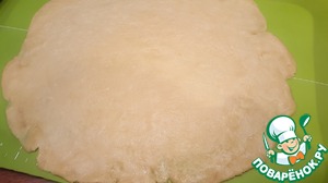 Достать тесто из холодильника и раскатать лепёшку, по размеру вашей формы + бортик. Удобно делать это на силиконовом коврике и перенести с него проще.