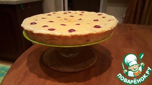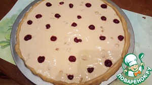 Аккуратно добавляем заливку и выкладываем вишню. Можно сделать из вишни рисунок, например сердечко, или просто прозвольно выложить. Отправляем пирог в разогретую духовку.