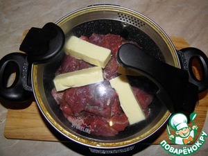 Мясо сложить в кастрюлю (кастрюля должна быть хорошая, с толстыми стенками и дном), посолить, поперчить (если не хотите сразу, специи можно добавить в процессе тушения), добавить сливочное масло