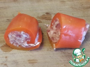 Сверните рулетиком. Если перцы по форме вытянутые, можно рулетик разрезать на 2 части