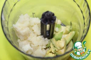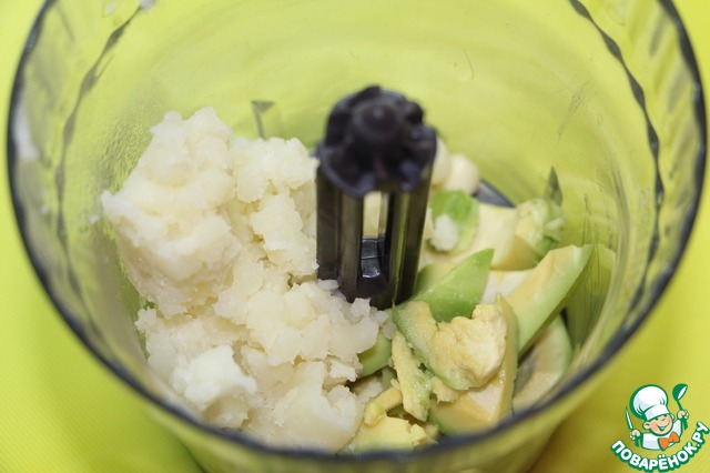 Сварить две картофелины, размять вилкой, слегка остудить. Авокадо почистить, половинку плода нарезать произвольно. В чашу блендера поместить размятый картофель, авокадо и зубчик чеснока, взбить до получения гладкого пюре.