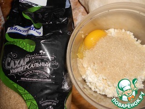 К творогу добавить ванилин, тростниковый сахар Мистраль, яйцо. Перемешать.