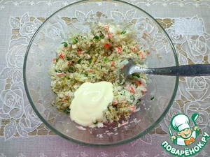 Добавить к крабовой смеси рисовые хлопья, перемешать, посолить, поперчить по вкусу. Добавить майонез, буквально ложку-две для скрепления массы.