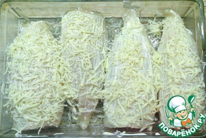 Уложить кальмары поросятками в форму, смазанной маслом. Смазать майонезом и посыпать оставшимся тертым сыром. Запекать в духовке при 200 С 10-15 минут до зарумянивания сыра. Я запекала на верхнем уровне.