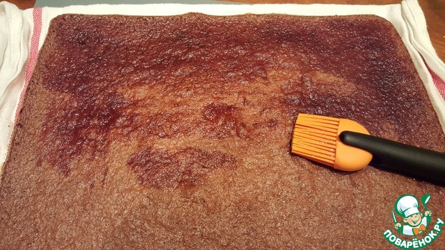 Вынимаем готовый бисквит, выкладываем на влажное полотенце. Я пропитала бисквит сиропом от вишнёво-айвового варенья.