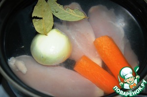 Холодной водой заливаем куриные грудки, луковицу, морковь.