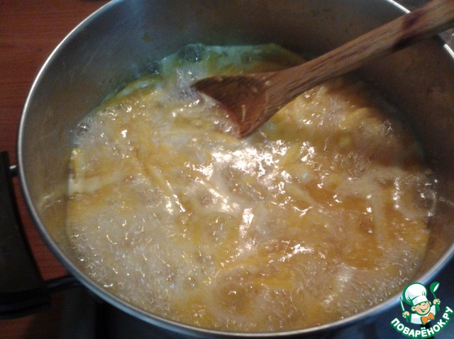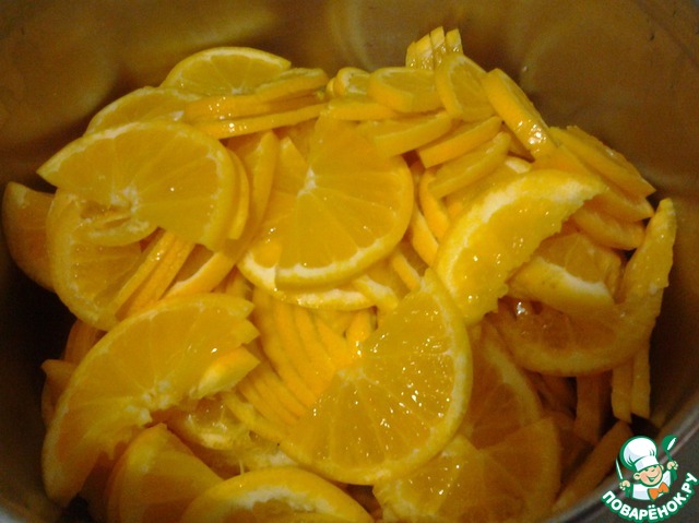 Через два дня сливаем воду и нарезаем апельсины на дольки, складываем обратно в кастрюлю и начинаем уваривать на среднем огне, постоянно помешивая