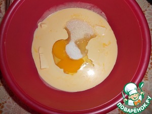 Растопить сливочное масло. Добавить яйцо, сахар. Перемешать.