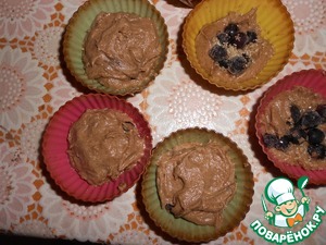 В силиконовые формочки для кексов выложить по 1 ст. л. теста, сверху выложить по 2 ч. л. ягод.
