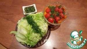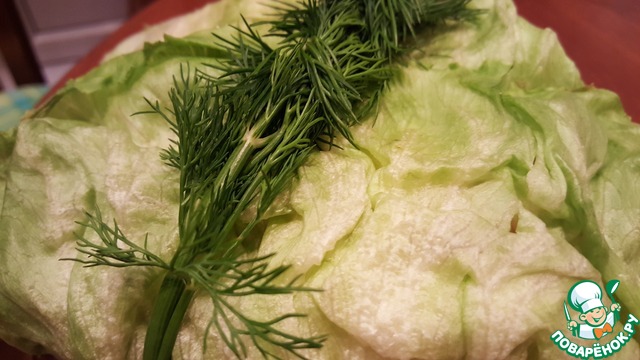 А теперь завернём листья салата, немного в шутку, как будто Вы оставили просто айсберг))). Я немного связала укропом, чтоб не заветривался и намекал на сюрприз внутри.