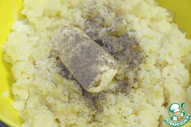 Картофель моем, чистим, отвариваем до готовности. Еще горячий картофель мнем толкушкой, добавляем соль, перец, сливочное масло.